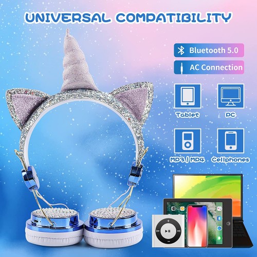 Kids Headphones, Unicorn Bluetooth/Wired Headphones with Microphone Adjustable Headband,85dB Volume Limited HD Sound Headphones for School, Birthday, Xmas, Unicorn Gift (Diamond Blue)